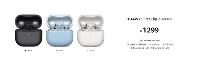华为FreeClip 2 耳夹耳机2025年10月14日10:08开启预售,10月20日10:08正式开售,首发价格1299元,用户可登陆华为商城及各大授权电商平台或前往华为体验店、华为授权零售门店进行购买。返回搜狐,查看更多