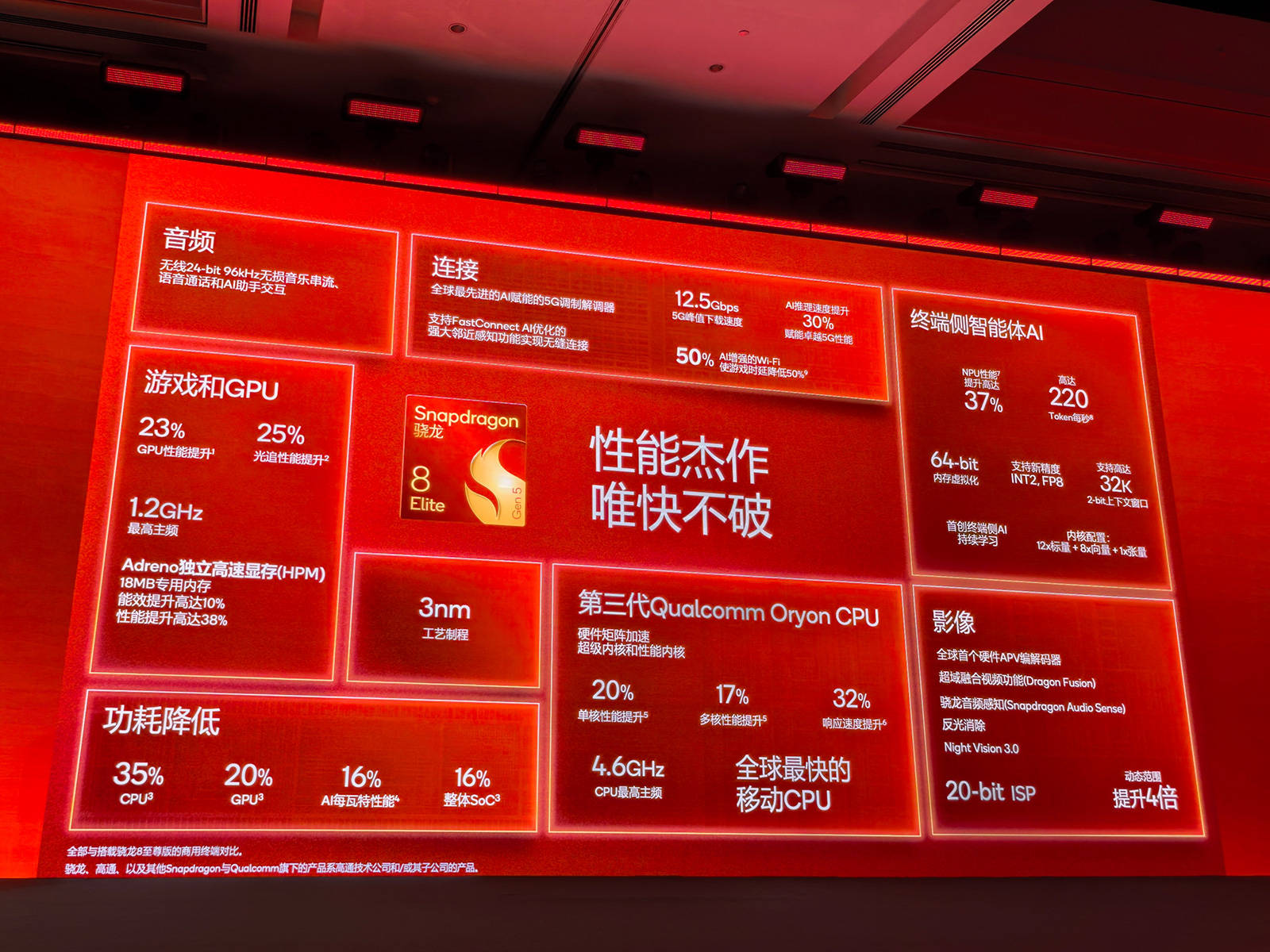 第五代骁龙8至尊版由台积电第三代3纳米制程打造,整体功耗可降低10%。高通强调这是“全球最快的移动CPU”,其升级采用骁龙第三代自研Oryon CPU,2+6的八核心设计,每簇缓存12MB。超大核主频飙升至4.6GHz,大核主频也有小幅度增长,峰值频率3.62GHz,单核性能与多核性能分别提升20%和17%,并带来响应速度32%的提速,CPU功耗至多降低35%。